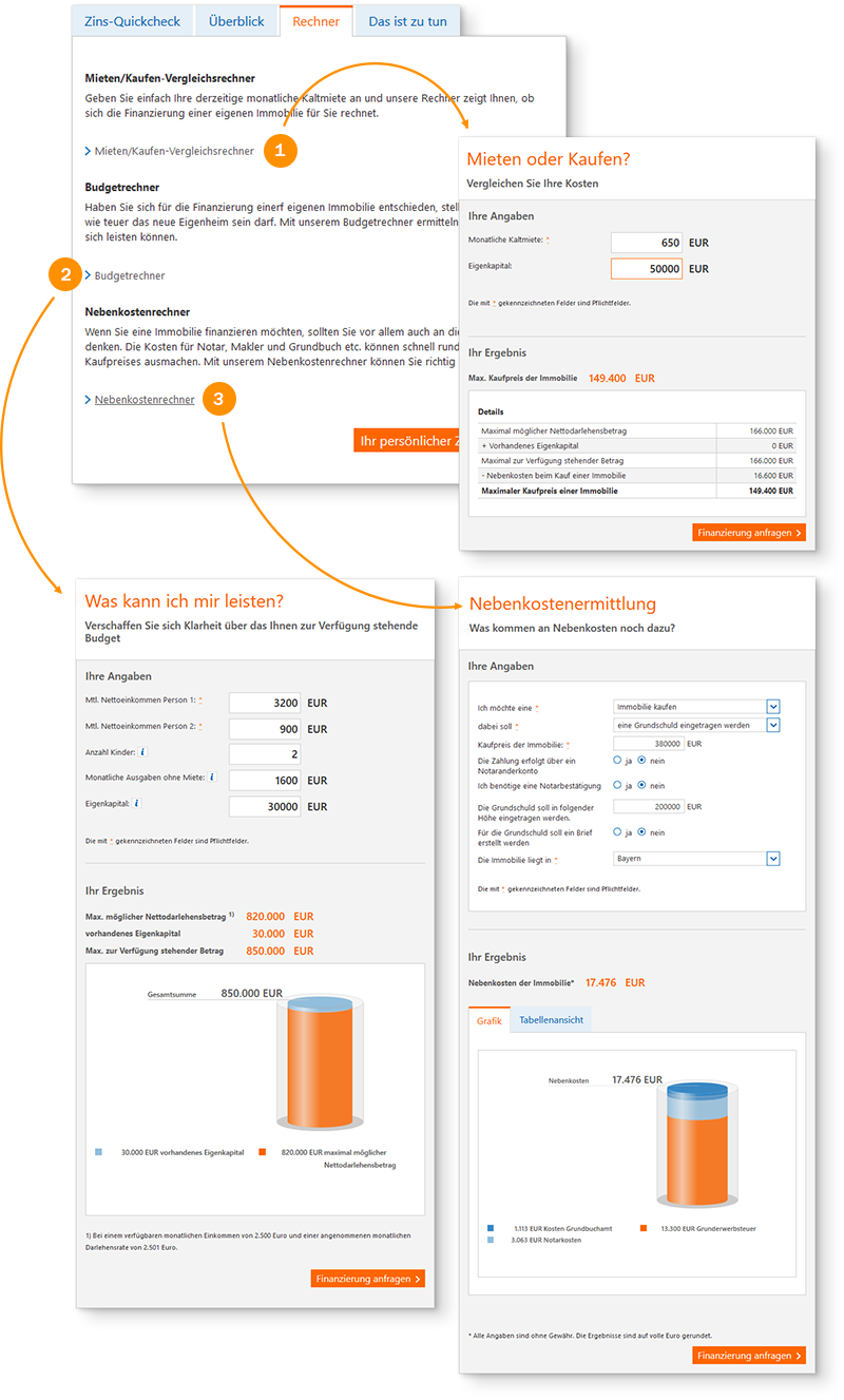 Verschiedene Rechnertools (Vergleichsrechner, Budgetrechner, Nebenkostenrechner) bieten dem Nutzer die Möglichkeit, seine individuelle Ausgangssituation für die Baufinanzierung zu ermitteln. Eine einfache Nutzerführung und grafische Darstellungen ermöglichen eine positive User Experience.