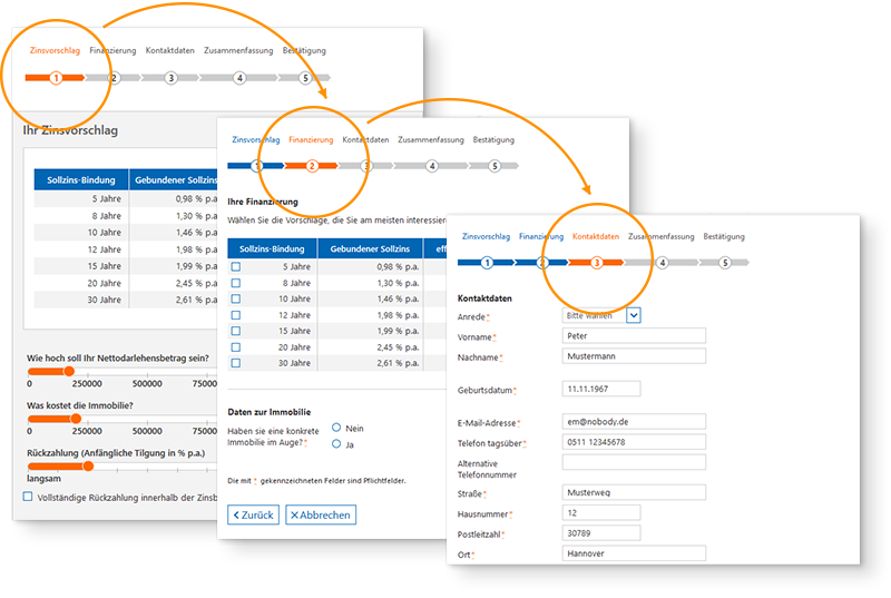Einzelne Prozessschritte führen den Nutzer systematisch durch die Finanzierungsrechnung bis hin zur Finanzierungsanfrage. Diese Anfrage (Lead) kann die Bank im GENOPACE-Tool BaufiSmart weiterbearbeiten.